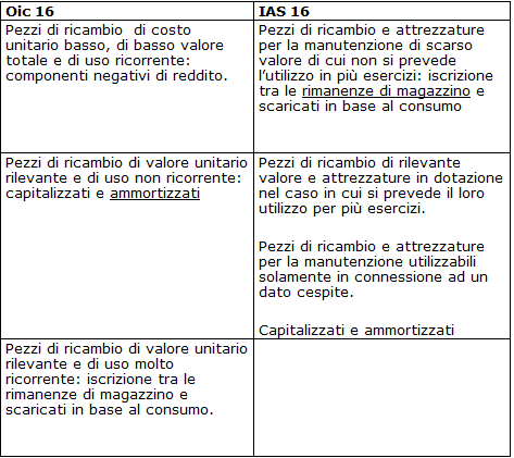 Di seguito riportiamo una tabella nella quale vengono sintetizzati i criteri di valutazione previsti dall’Oic 16 e dallo IAS 16 in materia di pezzi di ricambio e attrezzature per la manutenzione.
