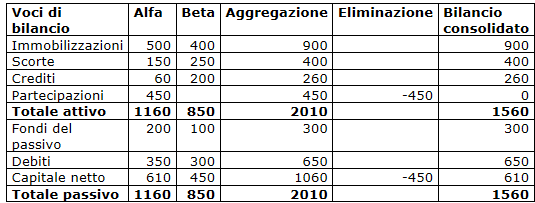Anche in questo caso occorre sommare tra loro i valori inerenti ad ogni voce di bilancio. Poiché il metodo di consolidamento è quello integrale sommiamo i valori delle voci presenti nel bilancio di Alfa con quelli presenti nel bilancio di Beta anche se la partecipazione di Alfa in Beta è solamente dell’80% e non si tratta di una partecipazione totalitaria come nell’esempio precedente.